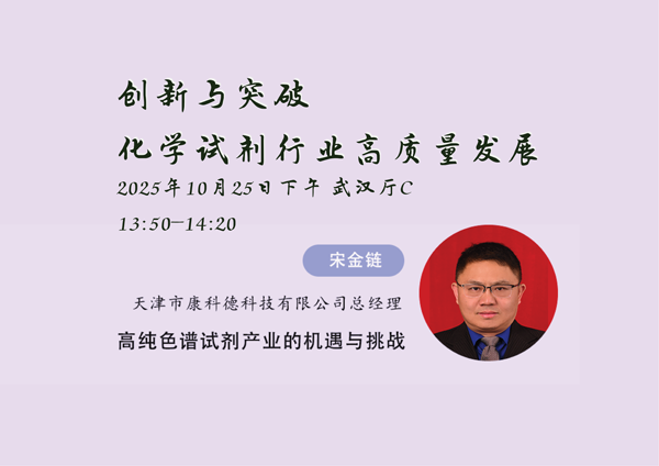 10月25日下午,“创新与突破—化学试剂行业高质量发展”分会场将在武汉厅C举行。分会场以“主题报告+高端对话”形式开展,聚焦试剂生产、高纯色谱、生物医药用试剂、功能性替代品及科研试剂生态构建等关键领域,共同探讨行业高质量发展路径。届时,康科德公司宋金链总经理将发表题为《高纯色谱试剂产业的机遇与挑战》的专题报告,深入剖析当前高纯色谱试剂产业所面临的发展机遇与关键挑战,分享公司在应对行业痛点、推动产业升级方面的实践与思考,为与会者提供前瞻视角与解决方案。