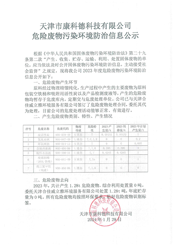 天津市康科德科技有限公司危险废物污染环境防治信息公示